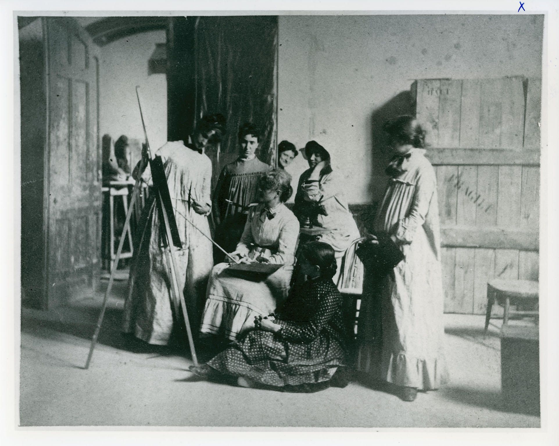 Black and white photograph reproduction of female painting class, c.1880s
