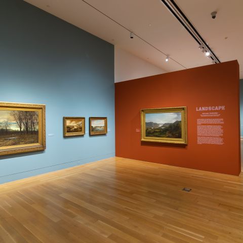 John Middleton standing inside the Philadelphia Museum of Art beside Thomas Cole's 1840 painting Schroon Lake, a work on loan from the Middleton Family Collection.