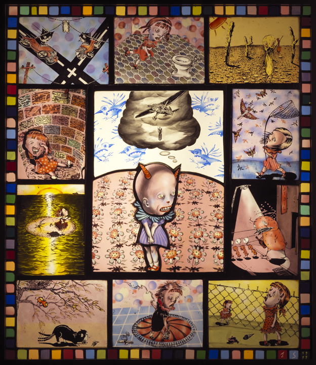 Judith Schaechter, "Autobiography," 1999. Stained glass window, 28 x 24 3/4 x 6 in. (71.12 x 62.865 x 15.24 cm.). Art by Women Collection, Gift of Linda Lee Alter © 1999 Judith Schaechter, 2011.1.24.