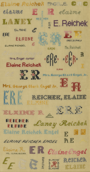 Elaine Reichek, "Sampler E.R.," 1999. Embroidery on linen, 19 x 10 1/2 in. (48.26 x 26.67 cm.); framed: 20 x 12 x 1 in. (50.8 x 30.48 x 2.54 cm.). Art by Women Collection, Gift of Linda Lee Alter © 1999 Elaine Reichek, 2011.1.50.