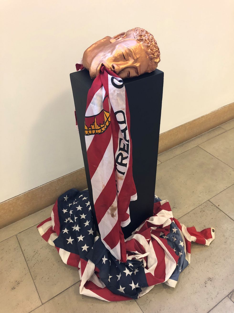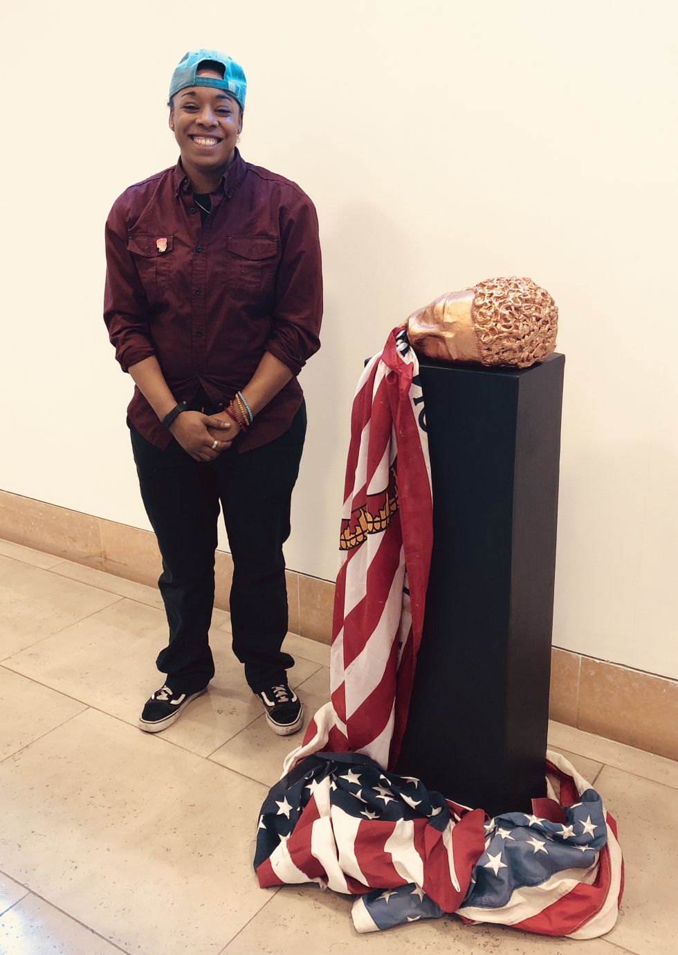 It was in a sculpture class taught by Professor Sarah Peters that Haskins first developed the piece America, I Can’t Breathe, currently on view in the west lobby of the Hamilton Building as a part of the Warming Exhibition. She was able to have several in-class critiques of the work, and was pleasantly surprised to learn that others were engaging with the subject matter. In addition to hand-molding clay to form the head of an African-American man, Haskins used several flags in the piece. One of these flags was given to her by her grandfather, who served in the navy. They cascade from the mouth of the sculpted head, and down the pedestal to pool on the floor. It’s a piece that has deep resonances for black community, and the racialized violence seen in Eric Garner’s 2014 death.
