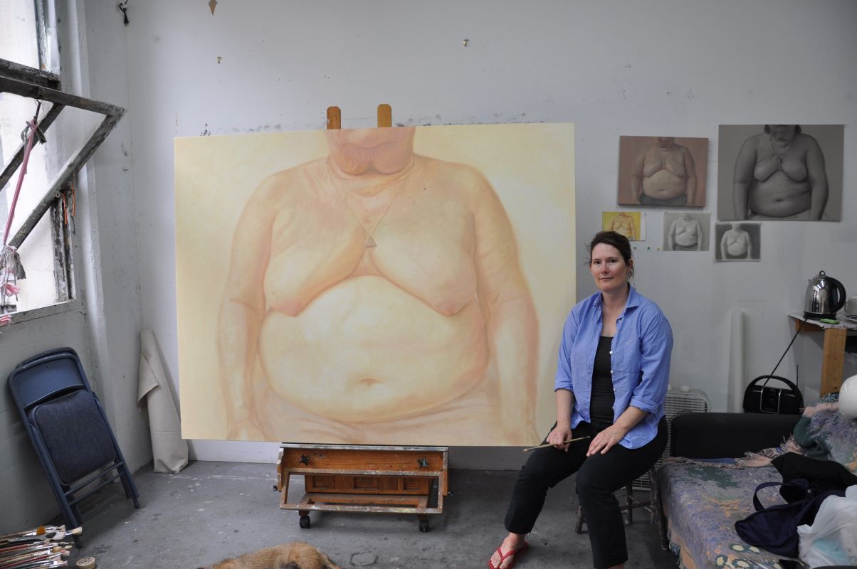 Haynes is known for her long-standing explorations of the torso as a site for painted portraiture. Works in her Breast/Chest Portrait Project, always painted from life and usually monumental in scale, have focused on themes of healing, trauma, and self-determination. Feminist and queer craft practices are often honored in her work. Bright colors, lively compositions, and multiple narratives conjoin in the depictions of bodies, altars, and her most recent body of work, which centers on the subject of birth.