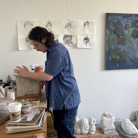 Eric Wagner in his studio sharing marble sculpture